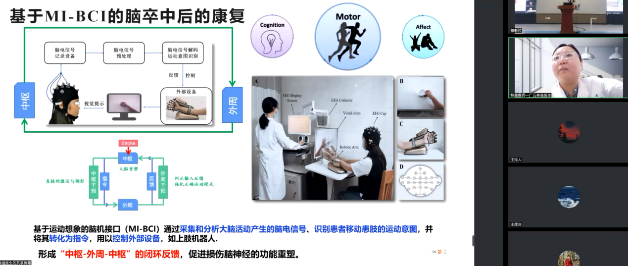 林强博士分享了“脑机接口技术在脑卒中康复的临床实践及机制探讨”,从功能障碍与mi-bci作用机理、mi-bci的临床治疗处方制定、mi-bci干预介导的神经可塑性机制在临床实践中的体现、mi-bci干预的局限性和挑战四个方面详尽的解释了脑机接口技术通过运动想象实现了从中枢—外周—中枢的闭环康复理论。并提出希望以后能更好的医工交叉融合,把bci技术真正的应用到临床。