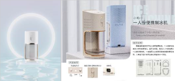 作品《小酌-便携制冰机》:随着越来越多的年轻人选择独居生活,一人食家电也成为z时代的新宠儿。基于此背景,设计了一款便携一人食份制冰机,一来独居人士或情侣能更便捷的享受冰饮,二来出门在外也可以随心所欲的diy饮品。